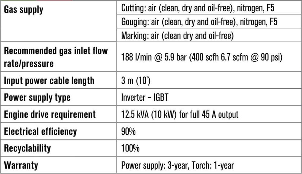 Gas supply Cutting: air (clean, dry and oil-free), nitrogen, F5